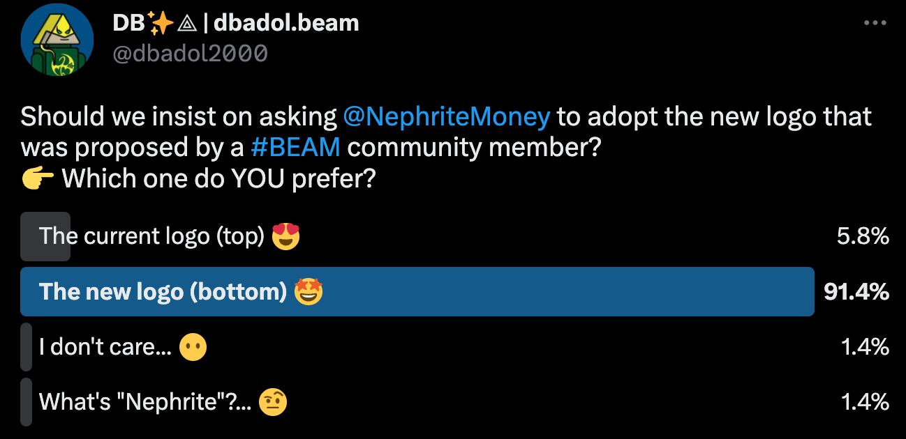 Nephrite was met with an interesting proposal suggesting a new logo for the protocol, with a Twitter poll put forth to gauge the communities thoughts. Shout out to DB for the initiative.